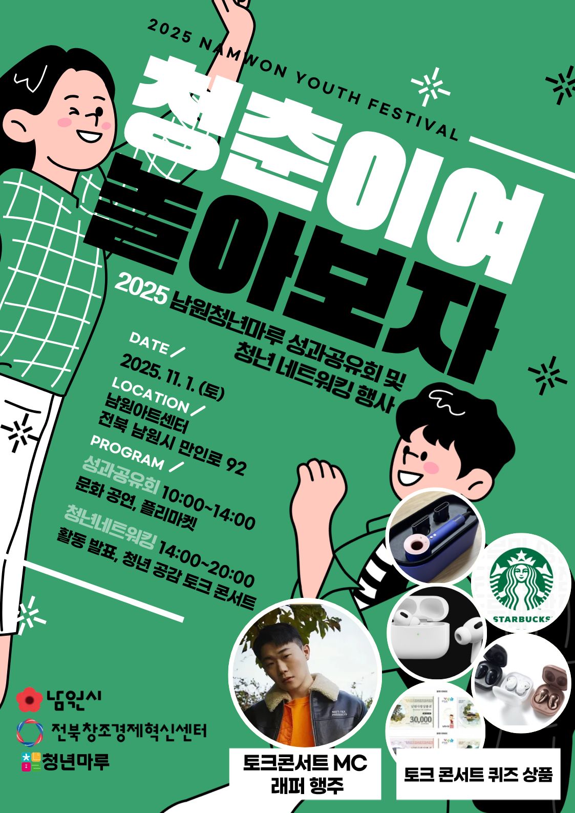 남원청년마루 성과공유회 및 청년 네트워킹 행사 - 원데이클래스: 칼림바 만들기 대상 : 남원 거주 15세 ~ 45세 청년 접수기간 : ~ 2025. 10. 31. 문의처 : 063-632-2028 -