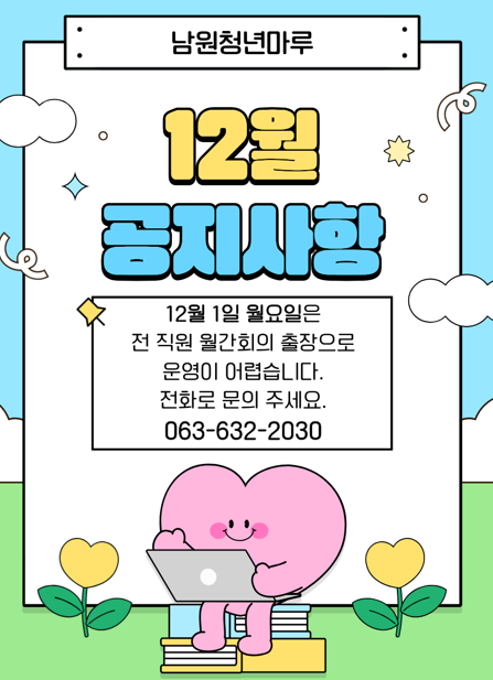 청년마루 청년마루 청년지원 창업지원 청년공간 커뮤니티 공지사항 센터소개 공지사항 찾아오시는길 센터소개 공지사항 찾아오시는길 공지사항 글읽기 청년마루 12월 공지사항 작성자 : 청년마루 님 작성일 : 2025-11-28 조회수 : 7 첨부파일 목록