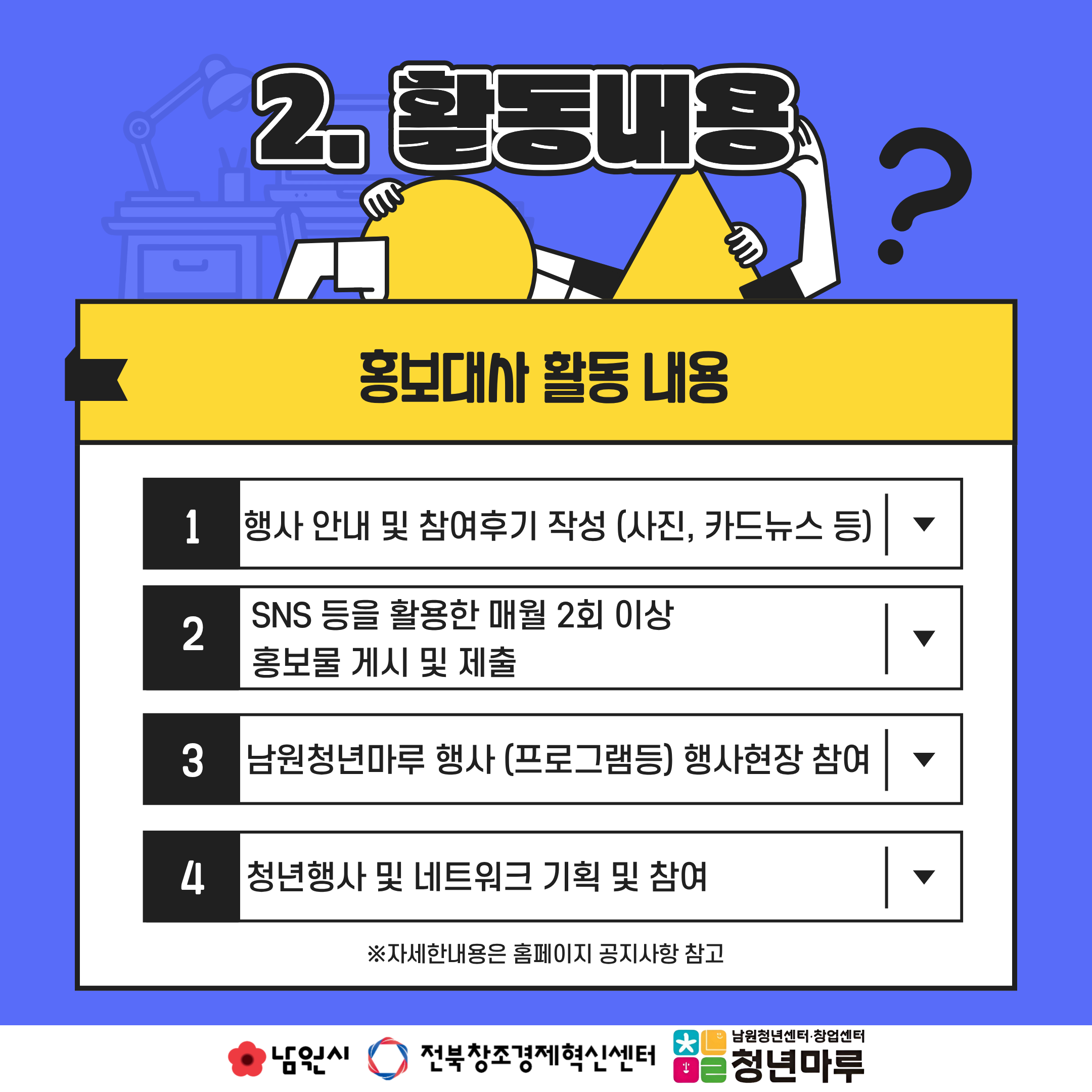 - 남원청년마루 행사(프로그램 등)에 대한 온라인 홍보(SNS 등) 활동 수행