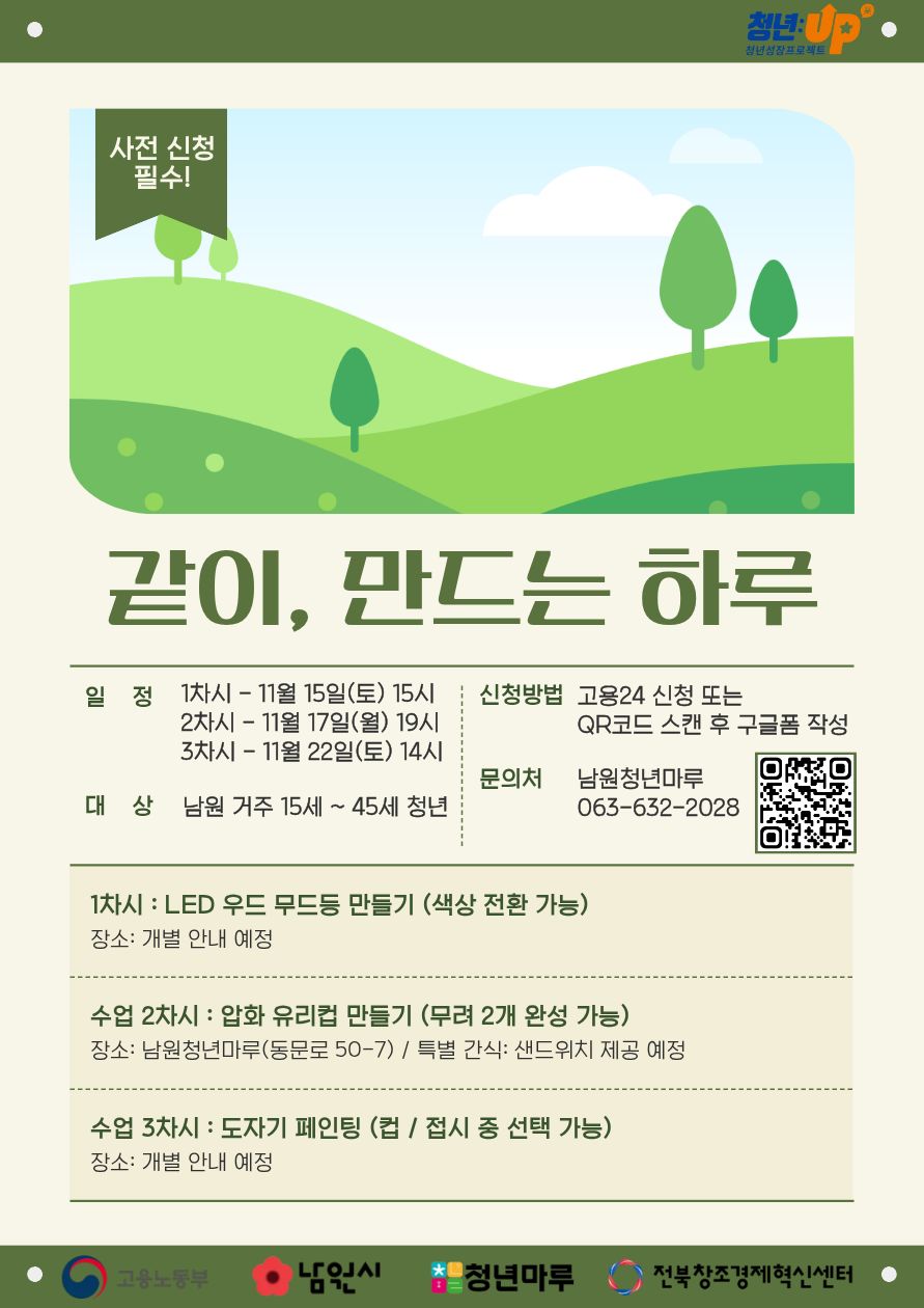 오늘은 내가 만드는 날! (우드무드등, 압화유리컵, 도자기페인팅) 대상 : 남원 소재 15세 ~ 45세 청년 접수기간 : ~ 2025. 11. 21. 14:00 문의처 : 063-632-2028 -